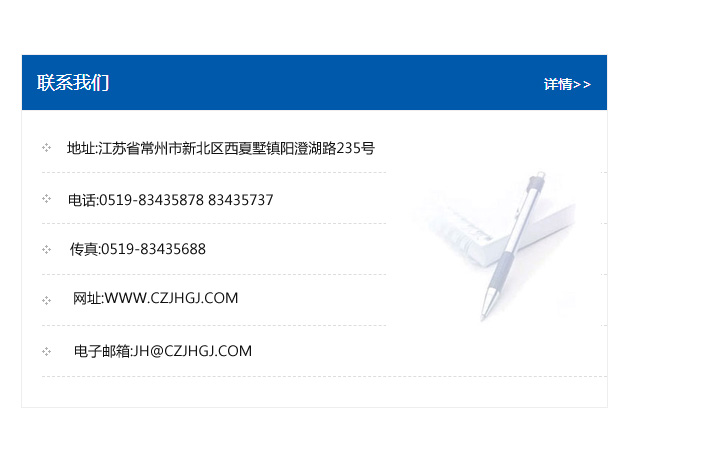 地址:常州市新北區友邦商務大廈1幢16、17層  電話:0519-85101652  傳真:0519-85112595  郵編:213022  網址:www_cz-jiayue_cn.hbdrgn.com  郵箱:xiajifengaa@163.com